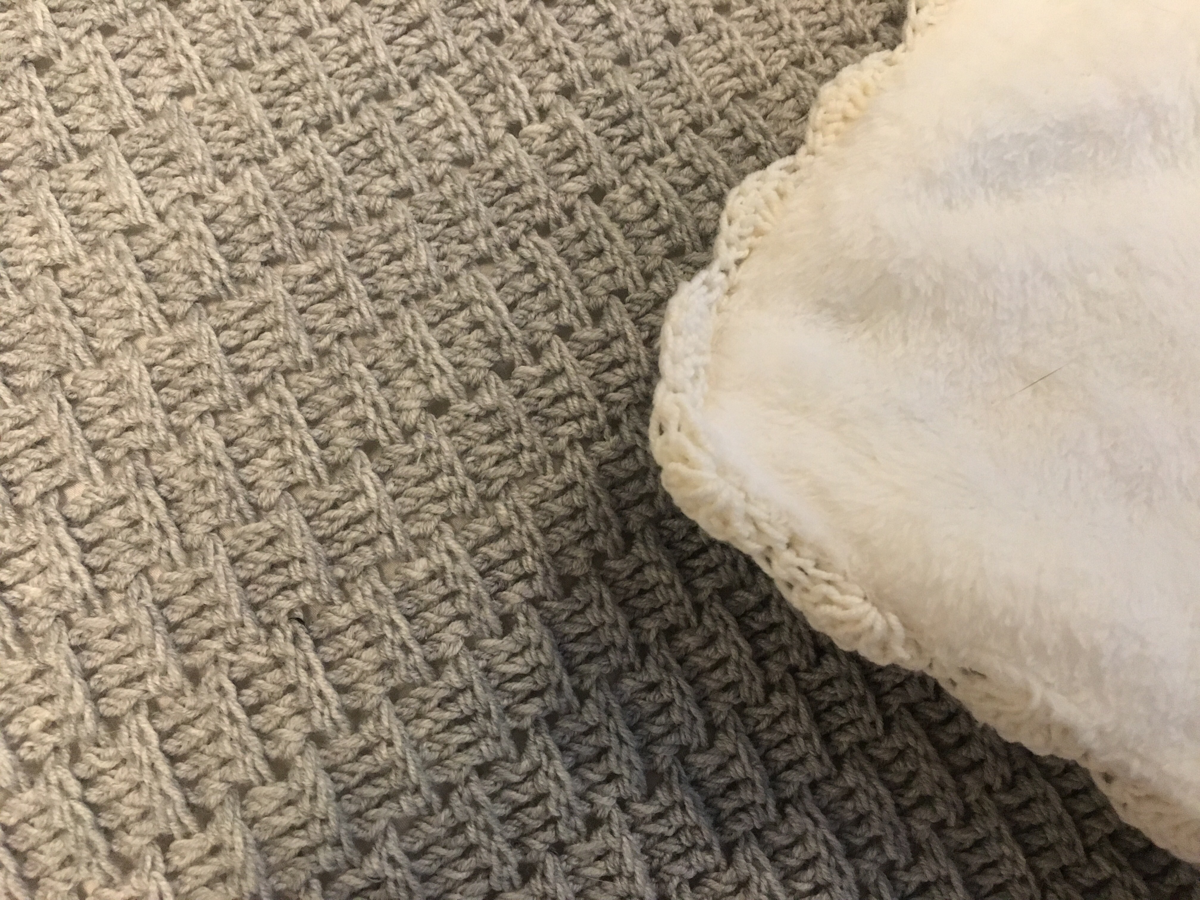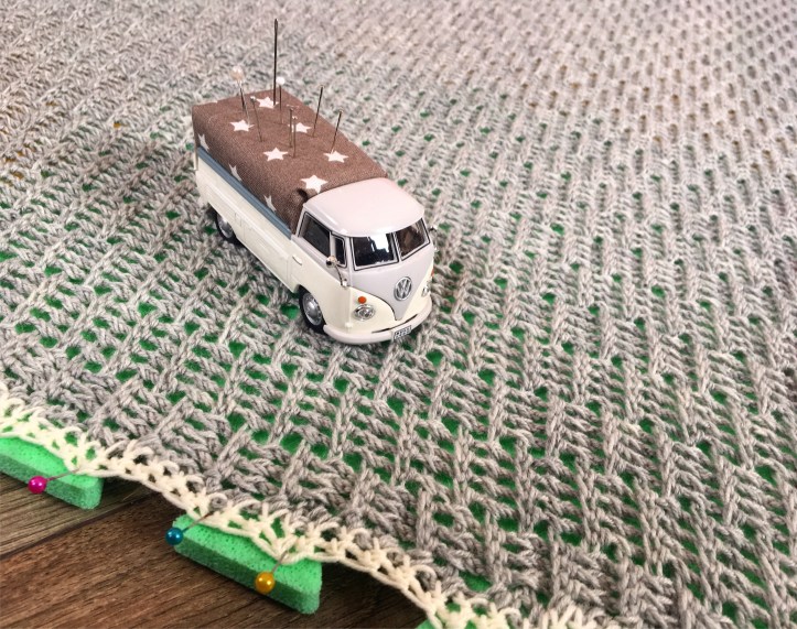 Ich wollte nämlich was Farbe und Muster betrifft etwas eher schlichtes haben. Babykleidung und Spielzeug sind meist schon bunt und wildgemustert genug. Nichts desto trotz, hat das Muster eine tolle Haptik. Verwendet habe ich die Baby Merino Wolle von Drops in Light Grey und noch in Natur für die Muschelborte. Gehäkelt habe ich mit einer 3er Nadel. Als ich mit dem häkeln fertig war, habe ich die Decke gewaschen und gespannt, bevor es ans Nähen ging.