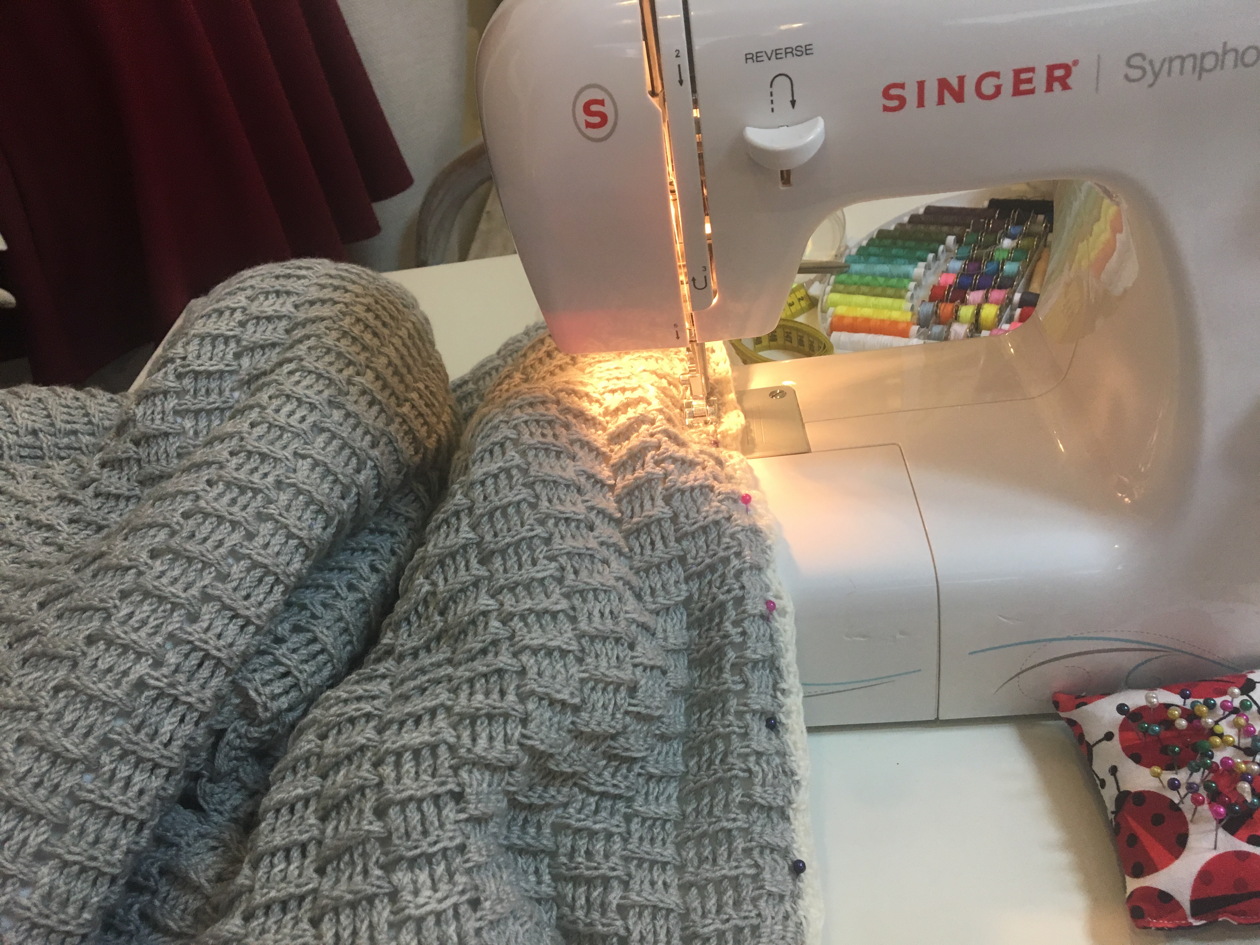 Die fertige Decke ist recht voluminös und hält einen auch schon an der Nähmaschine gut warm. Sie ist somit nur für den Hausgebrauch gedacht und nicht zum mitnehmen für unterwegs. Hierfür eignet sie sich definitiv nicht, wegen der unhandlichkeit und der hellen Farben.