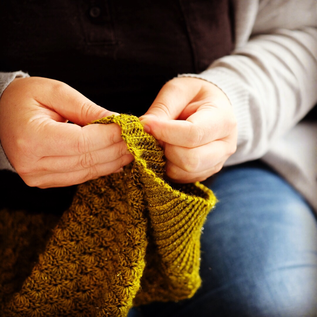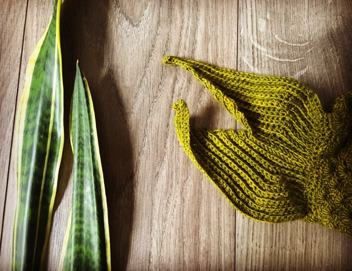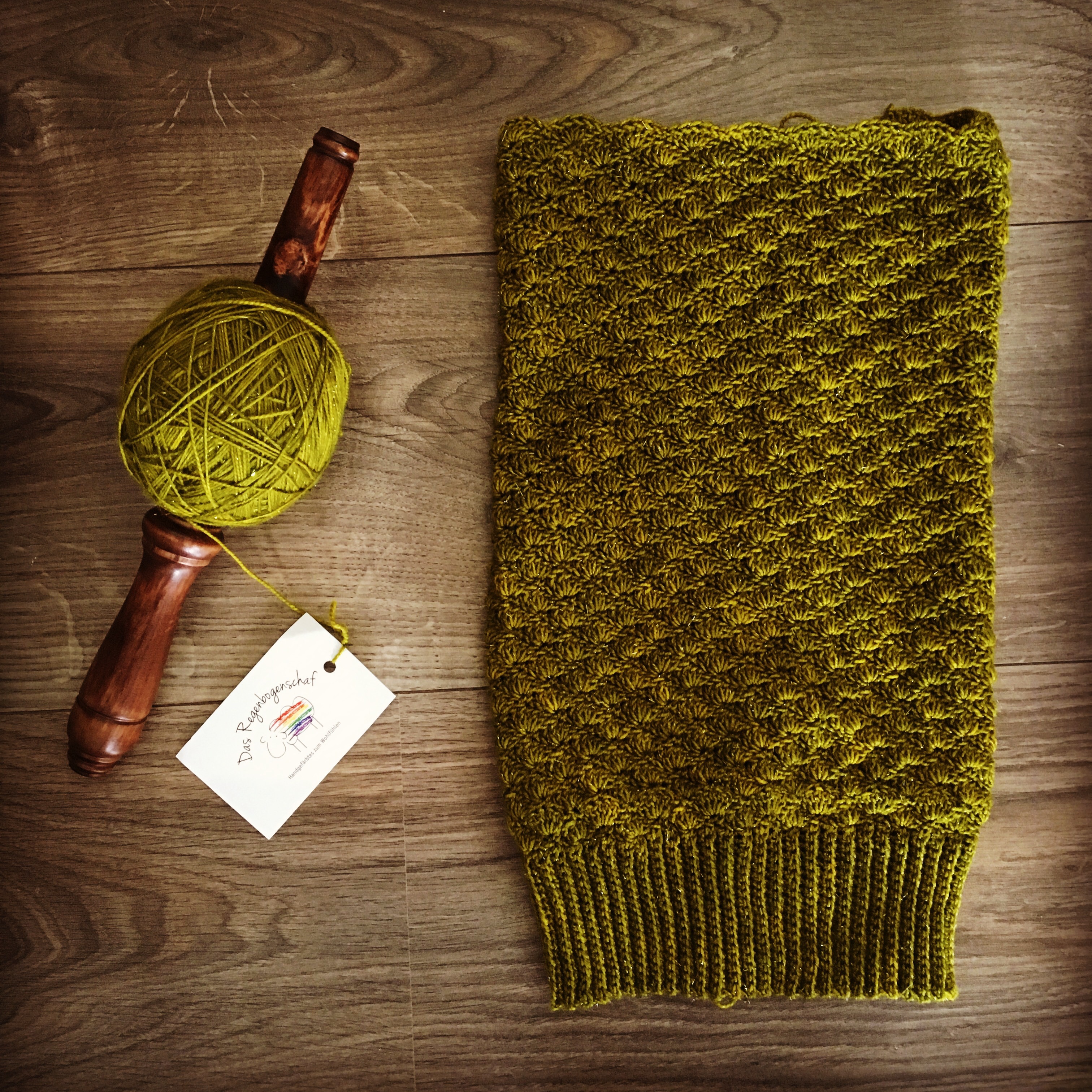 Dieses Jahr war dann das komplette Modell dran. Verwendet habe ich eine Merino Sparkles von Maike vom Regenbogenschaf in der Färbung „Nepomuk“. Die wundervoll glitzernde Wolle habe ich bei meinem allerersten Schwabsburger Wollfest geshoppt. Seitdem wartete sie hier in meinem Wollvorrat sehr geduldig auf genau das richtige Projekt. Und dieses Jahr sprang mir die Wolle, dann passend zur Farbe des Jahres, Greenery förmlich ins Auge und musste dringend verarbeitet werden.