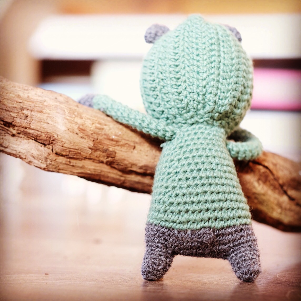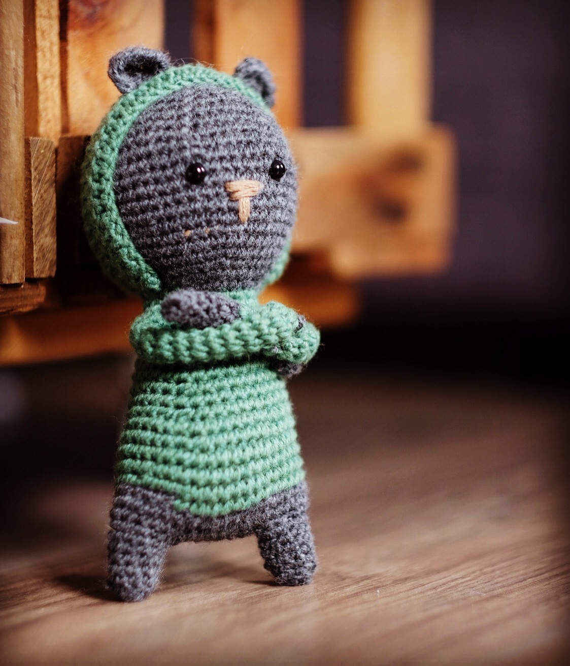 Das kleine Bobbli kommt mit seiner Kapuze ganz cool daher und ist definitiv mal ein etwas anderes Kuscheltier. Durch die dunkle Wolle wird, wie ich finde der Coolness Faktor nochmal deutlich erhöht. Besonders gelungen finde ich das kleine Puschelschwänzchen, das aus einer Popcornmasche gehäkelt wird. Es hat mir auch viel Spaß gemacht den kleinen Bären in Szene zu setzen für Fotos.