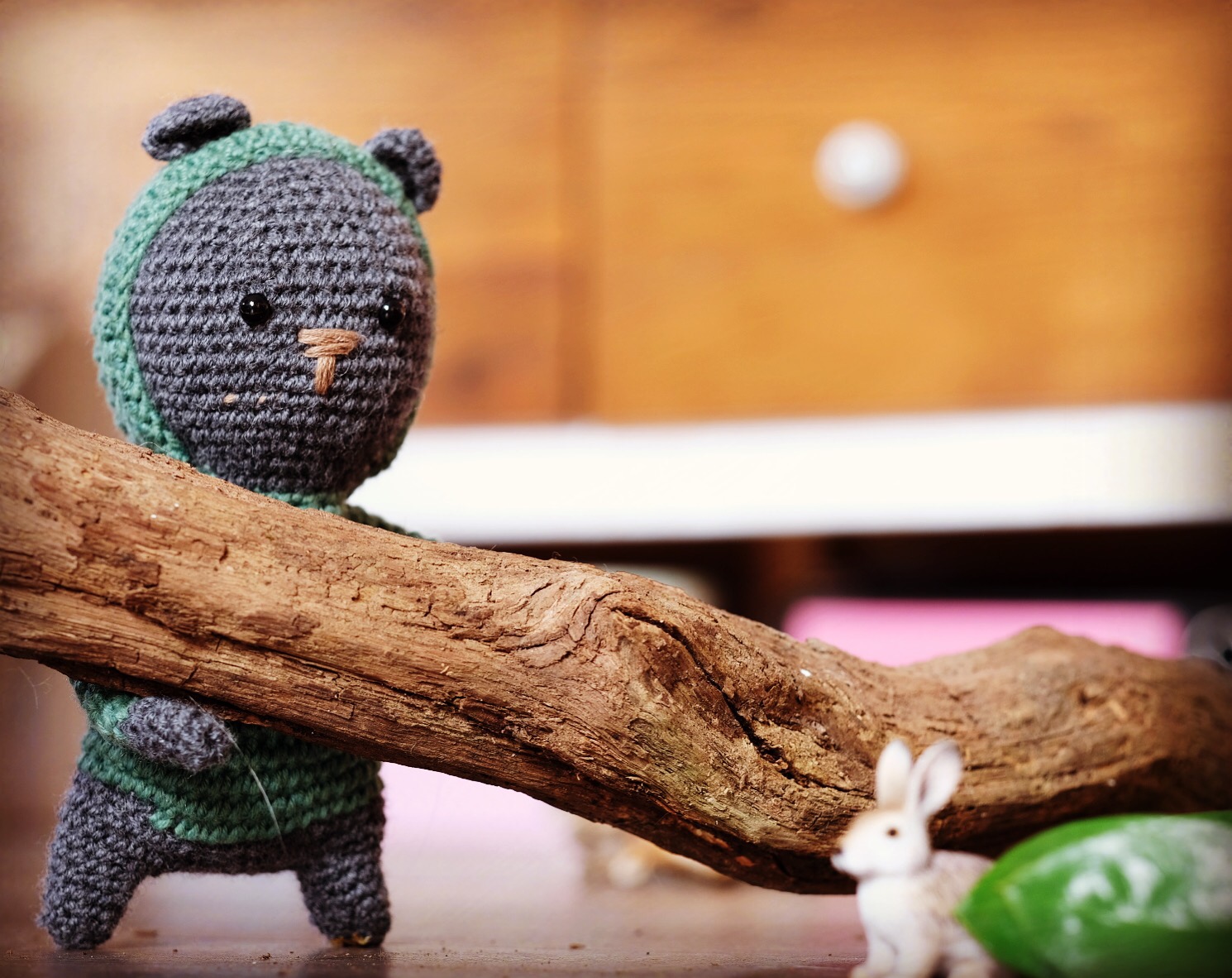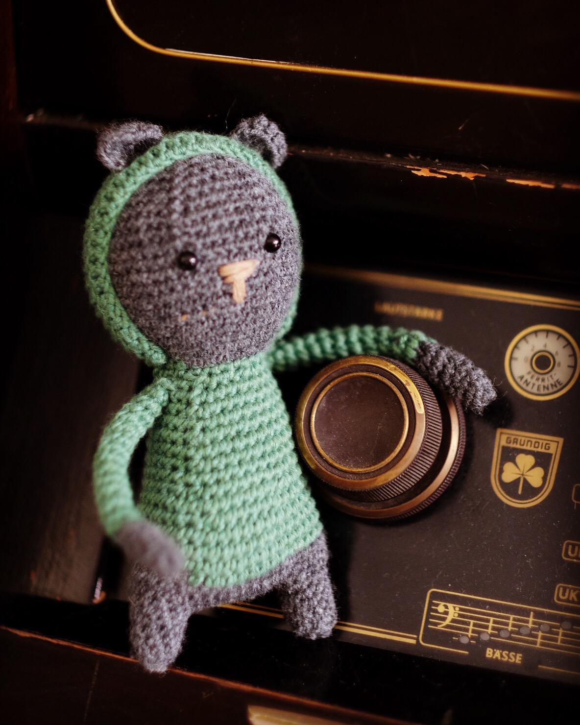 Ich finde ja der freche Kerl könnte noch einen kleinen gehäkelten Ghettoblaster als Accessoire vertragen. Jemand eine Idee wo es dafür eine Anleitung gibt? Dann müsste er nämlich nicht mehr dauernd an unserem alten Grundig Radio rumhängen. 😉