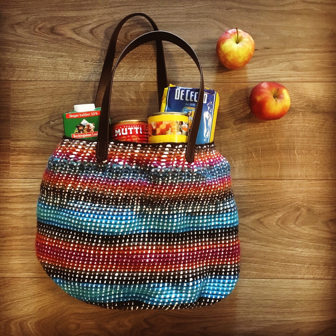Wollverbrauch: 146g der Colorflow 808 der Wollspinnerei Ferner, 310g Recotton Stoffgarn in weiß, Lederhenkel von Rico Design, Insgesamt: 456g