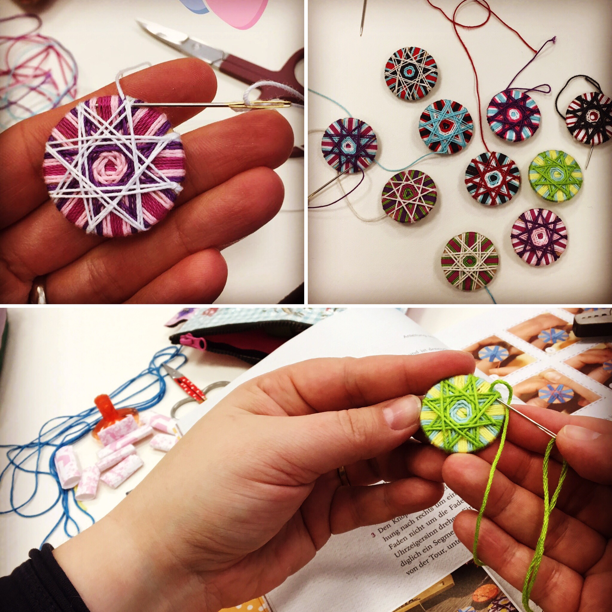 Gleich zu Anfang hielt ich meine erste Session zu Posamentenknöpfen. (Ein bißchen aufregend war das ja schon für mich.) Erst vor kurzem wurde ich von Helene Weinold bei der Hygge Stricknacht in Augsburg knopfifisziert. Und wurde prompt via Instagram gebeten diesen Virus auch auf dem Yarncamp zu verbreiten. Es sind einige wunderschöne Knöpfe dabei heraus gekommen. Ich habe mich gefreut, dass das so großen Anklang fand. Vielen Dank auch nochmal an Prym, das wir Sticknadeln und Scheren bereitgestellt bekommen haben.