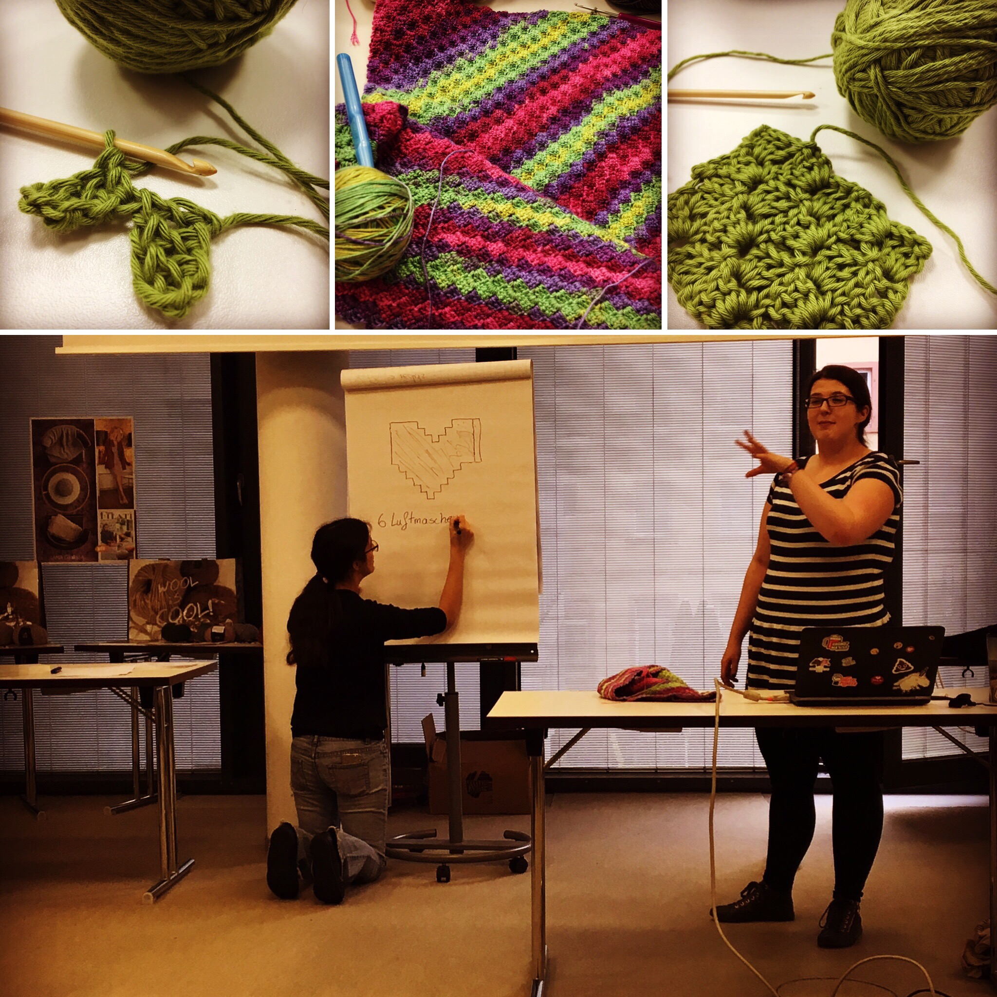 Zuerst ging ich in die Corner to Corner Häkel- Session von Jenny und Melanie. Das sogenannte Pixelhäkeln ist schnell gelernt. Aus Stäbchen und Kettmaschen entstehen kleine Quadrate, die in diagonalen Reihen gehäkelt werden. Pro Tipp der Session, man braucht nicht viel Geld für Anleitungen ausgeben. Die Vorlagen können ganz einfach auf Karopapier selbst erstellt werden oder als kostenlose Bügelperlen Vorlage über die Google Bilder Suche gefunden werden. Danke euch beiden, es hat Spaß gemacht und in Gedanken plane ich schon mindestens fünf verschiedene Decken…