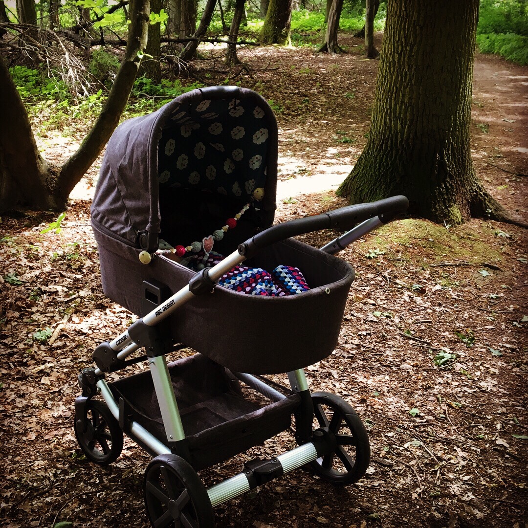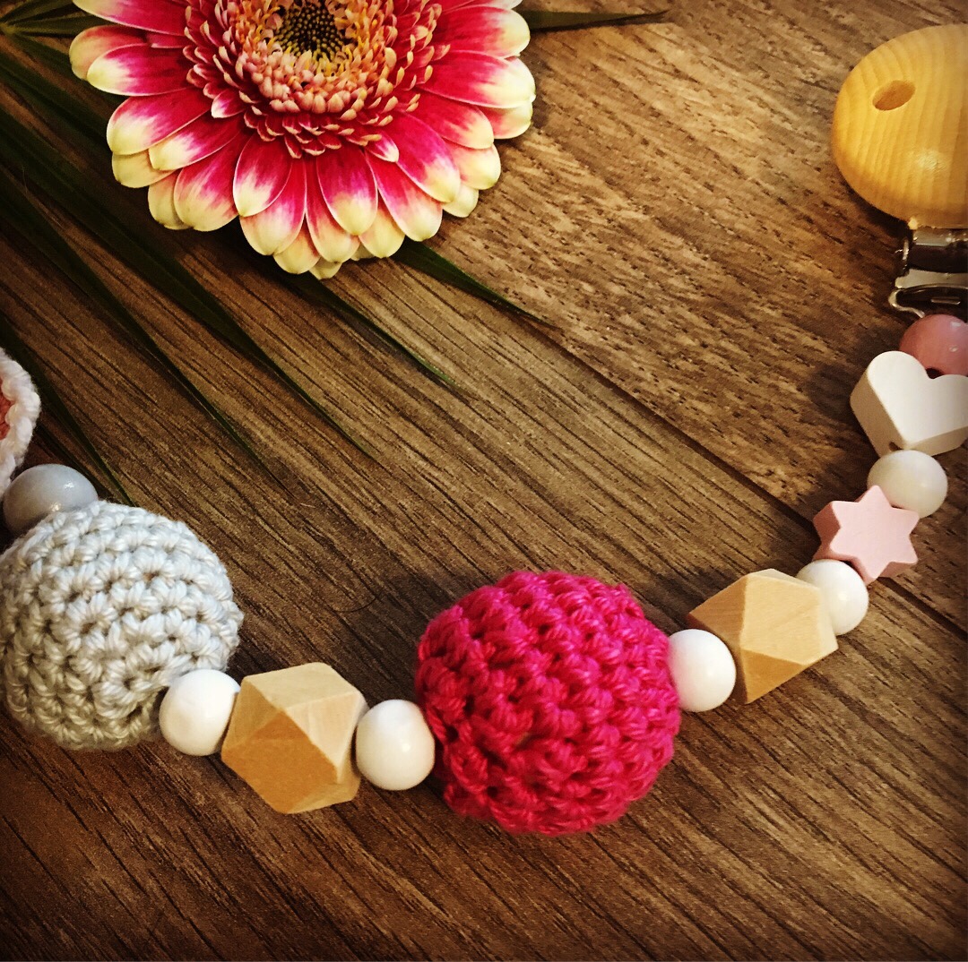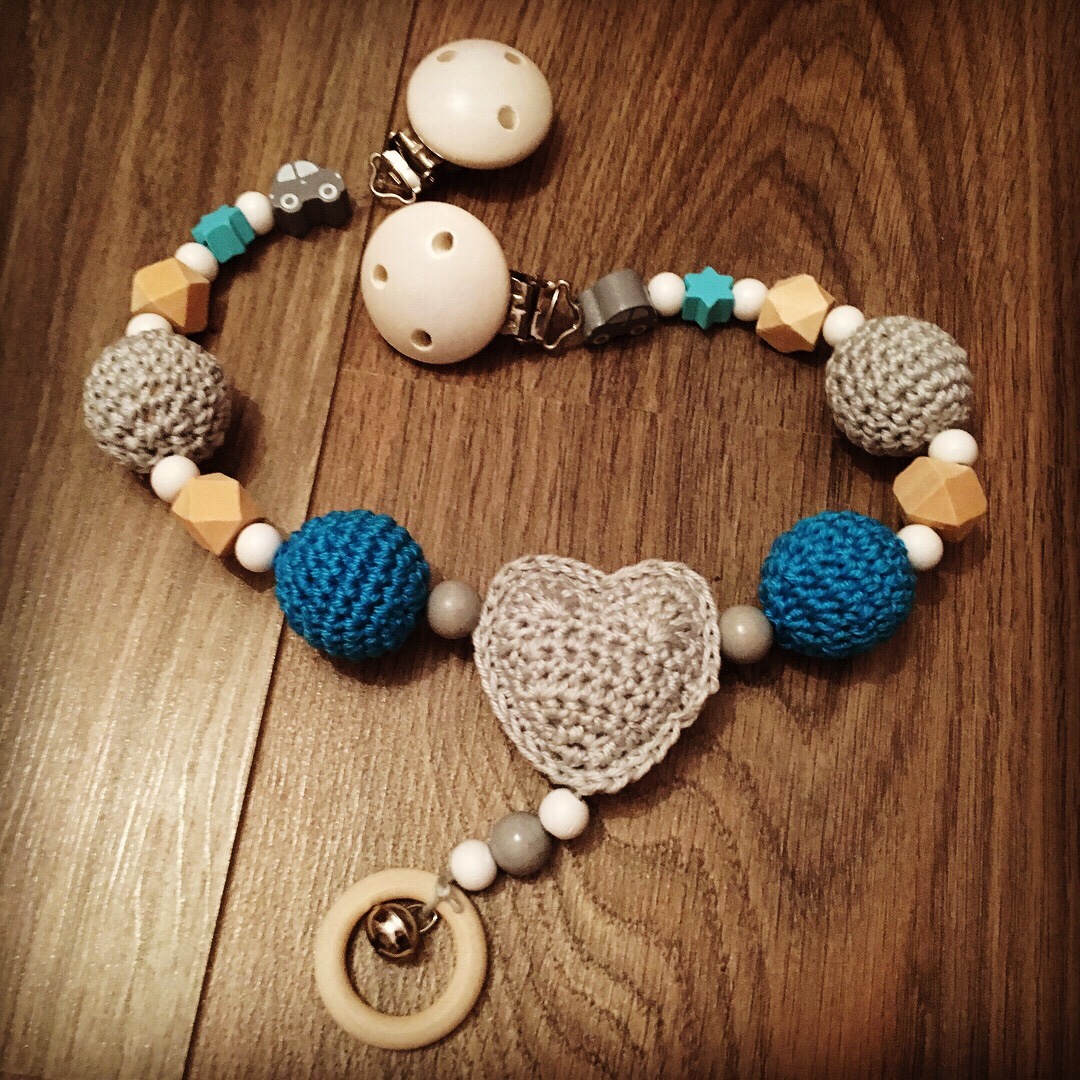 Was uns auf jedem Spaziergang begleitet ist meine selbstgemachte Kinderwagenkette. Dank der Schnullerclips lässt sie sich ganz leicht am Kinderwagen oder auch am Autositz beschäftigen.