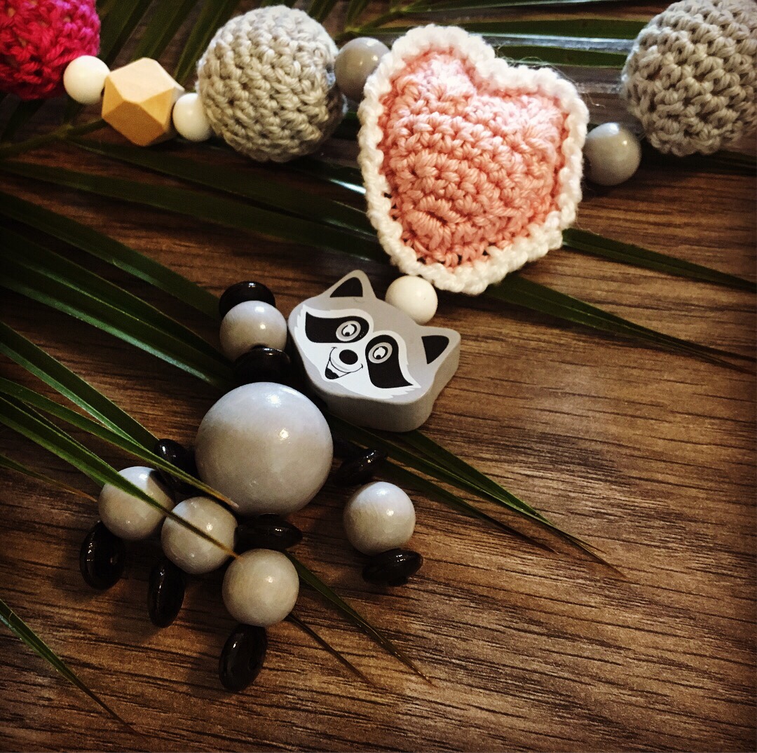 Eurer Kreativität sind da keine Grenzen gesetzt. Um die Haptik für euer Baby ansprechend und abwechslungsreich zu gestalten, empfehle ich euch runde und eckige Kugeln, eventuell auch noch ein paar Motivperlen (Sterne, Herzen, Autos etc.). Ebenso ist es schön, wenn unter den ganzen festen Holzperlen sich noch etwas weiches, wie mein gehäkeltes Herzchen befindet. So wird die Kette nicht so schnell langweilig. Wenn ihr das selbst ertragen könnt, könnt ihr auch noch Quietscher oder Glöckchen mit ein arbeiten. Besonders gut haben mir diese sogenannten Fädelkörperperlen in Tieroptik gefallen, also kam noch ein kleiner Waschbär hinzu.