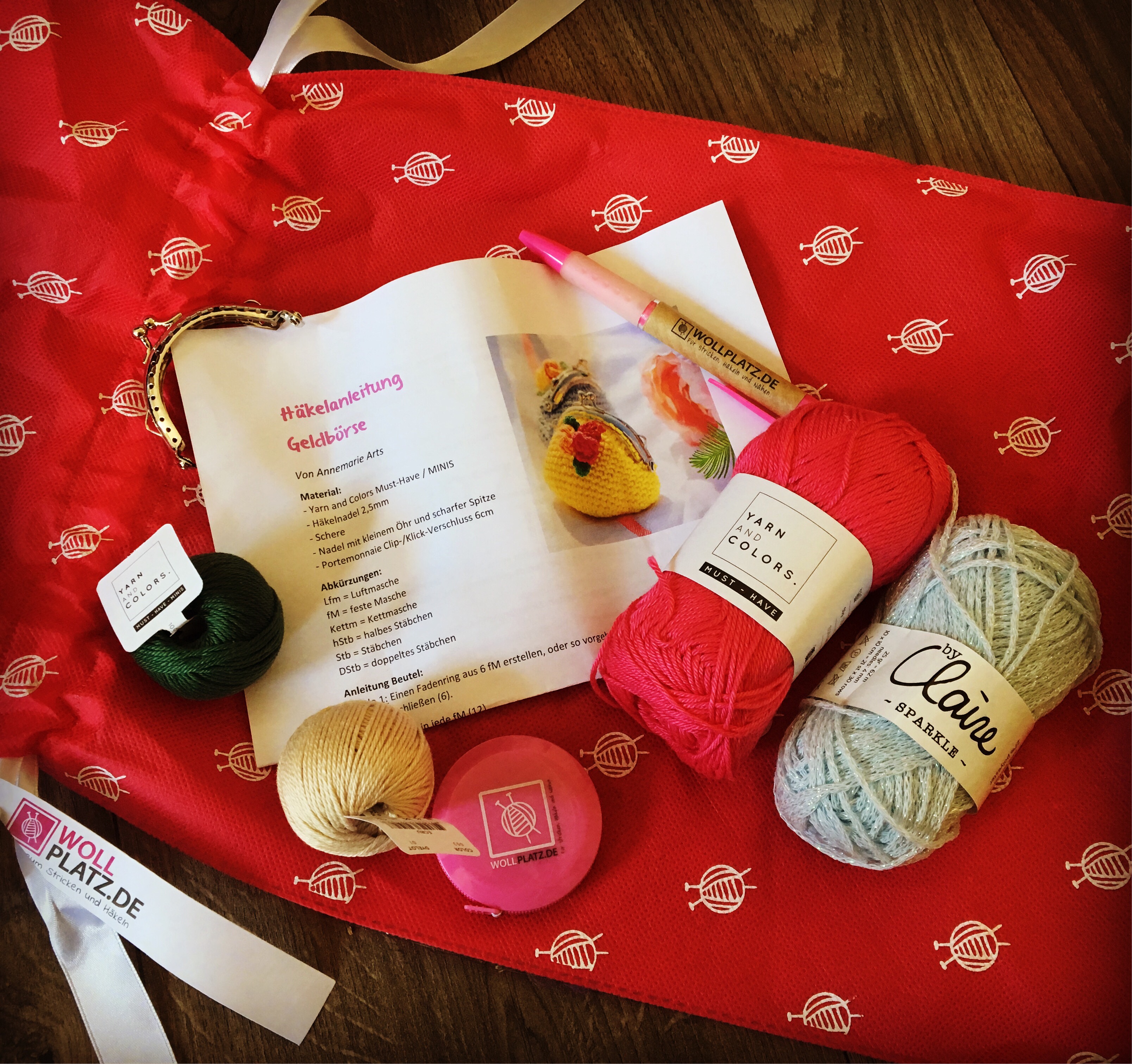 In der diesjährigen Goodiebag des Yarncamps befand sich ein kleines Häkelkit für eine kleine Geldbörse von Wollplatz. Ich habe mich wirklich sehr gefreut über dieses Kit. In der sonst doch sehr stricklastigen Goodiebag hat es mein Häkelherz im Sturm erobert.