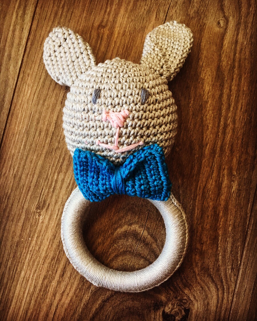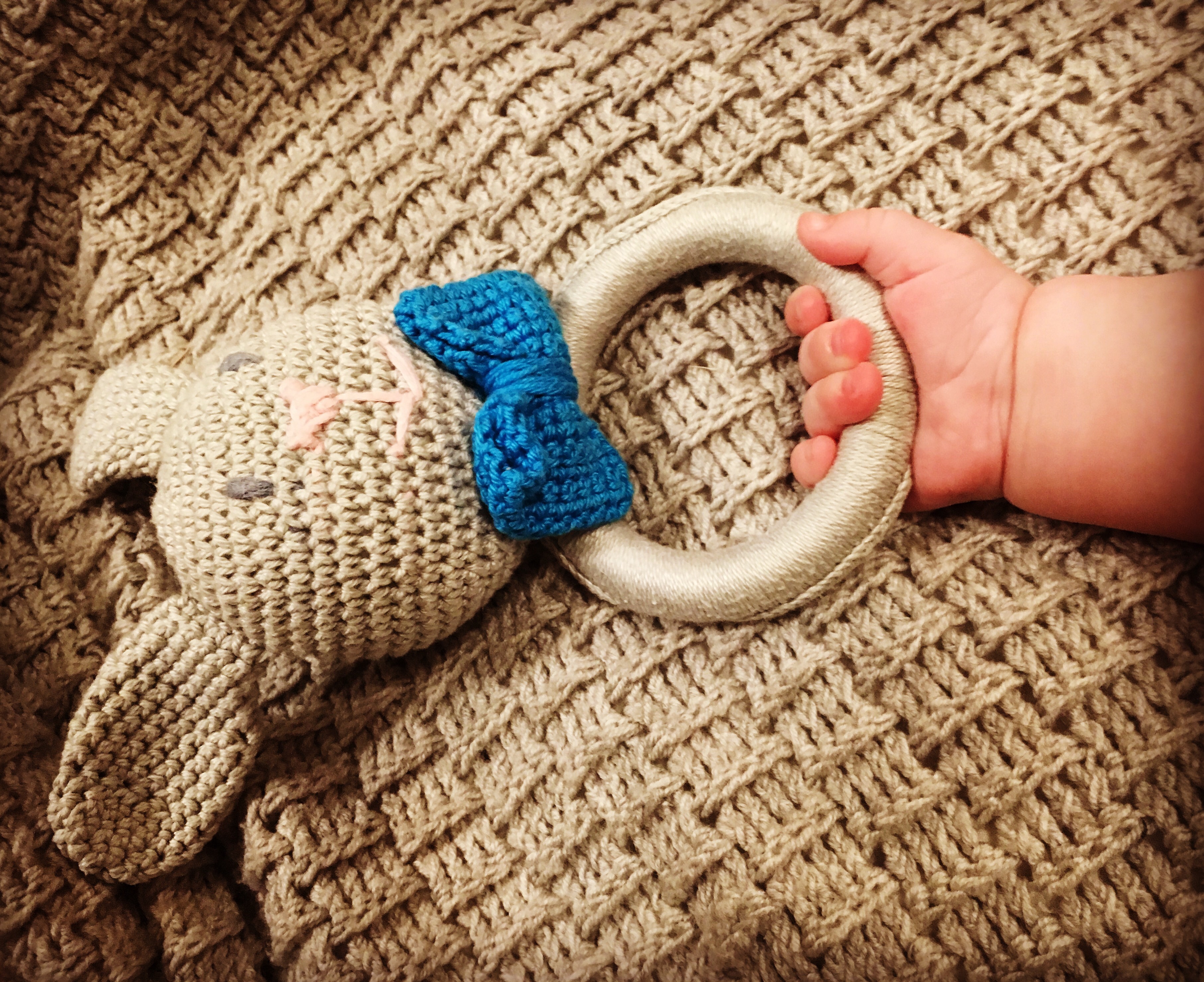 Für den Greifling habe ich den Kopf von Hase Fips von Ribbelmonster gehäkelt. Und ihn anschließend an einem mit festen Maschen umhäkeltem Holzring festgenäht. Hier braucht man viel Spannung beim annähen in den Fäden, damit der Kopf nicht immer wieder zu einer Seite weg kippt.