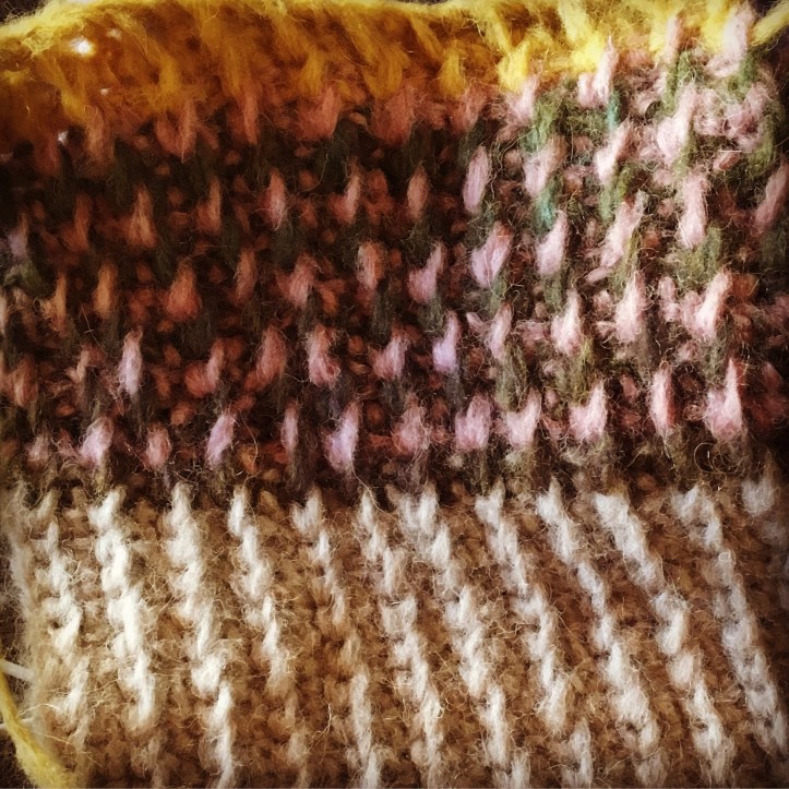 Farblich gesehen habe ich mich bei diesem Projekt mal aus meiner Komfortzone raus bewegt. Anfangs war ich noch etwas skeptisch, ob gelb und rosa wirklich so gut harmonieren werden, bin aber nun überzeugt und liebe meinen Schal. Interessant finde ich, dass das eher bräunlich wirkende Garn den Farbtitel „Grün-Lila“ trägt, was man erst bei ganz genauem hinsehen auch erkennt.