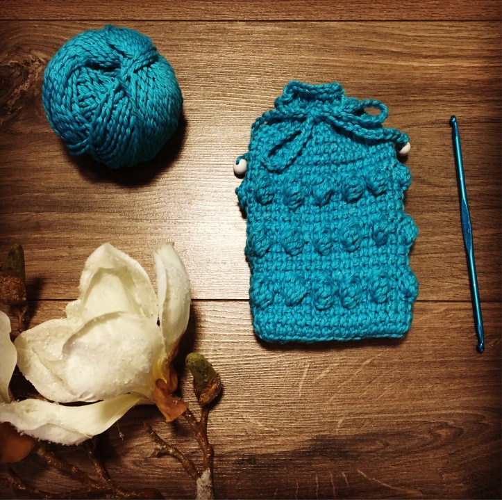 Mich hatte ganz spontan das Noppenmuster angesprochen, welches ich gleich in einer kleinen Häkellei getestet habe. Eine liebe Freundin hatte sich zum Geburtstag ein Tasselinchen gewünscht und ich habe dann noch einen kleinen Beutel dafür gehäkelt. Das Noppenmuster besteht aus dem tunesischen Grundstich und aus zusammenabgemaschten Stäbchen, welche einem vom normalen Häkeln ja bereits bekannt sind. Für das Häkeln in Runden, benötigt man eine doppelseitige tunesische Häkelnadel und zwei Knäuel Garn, jeweils eins für die Hinreihe und eins für die Rückreihe. Ich habe den Beutel als offenen Schlauch gehäkelt und die Unterseite später zusammengenäht. Damit ich den Faden zum verschließen des Beutels einfädeln konnte, habe ich noch eine Reihe im Länglichem Gittermuster gehäkelt, einem Muster, das durch Luftmaschen „Löcher“ bekommt. Beide Muster gingen mir gleich leicht von der Hand, nur der Maschenanschlag ist für mich noch etwas ungewohnt und fummelig.