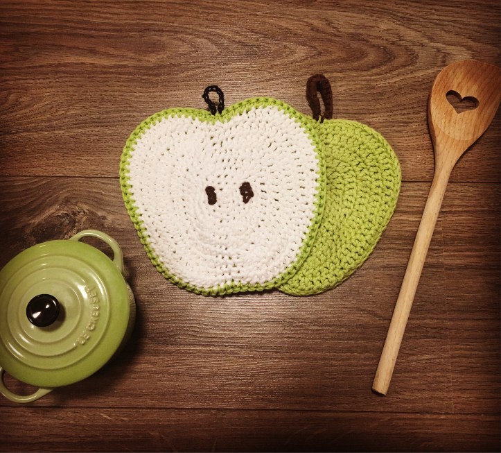Da mein eigener Apfeltopflappen mittlerweile etwas in die Jahre gekommen ist und das Fruchtfleisch etwas vergilbt aussah, habe ich mir auch noch einen neuen gehäkelt. In hellgrün und weiß, wie ein Granny Smith Apfel.