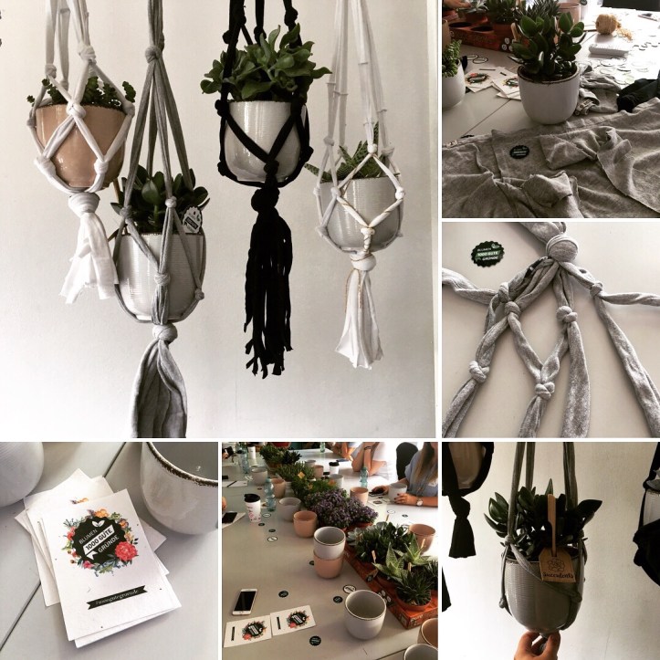 Danach hat Sophie von Sophia Galeria einen super Upcycling Workshop gehalten. Aus alten T-Shirts haben wir Makramée Pflanzenampeln geknotet. Sie hatte extra für den Workshop Shirts in der Familie gesammelt und bei 1000 Gute Gründe für alle Teilnehmer wunderschöne Sukkulenten und Übertöpfe besorgt. Es hat super viel Spaß gemacht und war auch ganz leicht. Die hängenden Pflanzen sind ein echter Hingucker, das werde ich auf jeden Fall noch mal machen. Falls ihr auch Lust habt, hier findet ihr die Anleitung dafür.