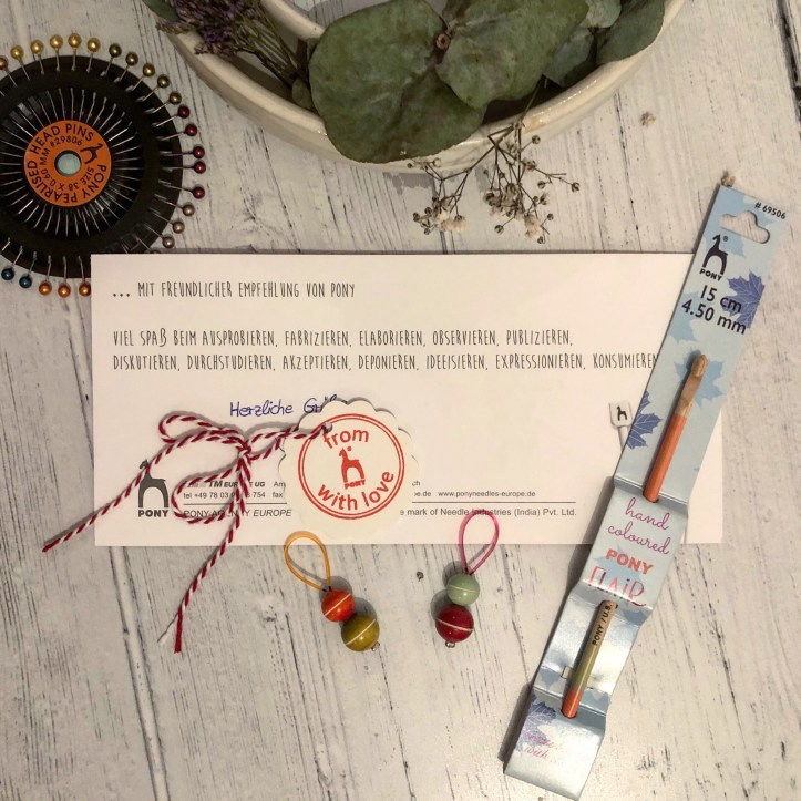 Wenige Tage später kam dann auch noch mal Post von Pony. Ich habe noch eine Pony Flair Häkelnadel zum testen bekommen, da es vor Ort ja nur Stricknadeln gab. Aufmerksame Leser wissen, dass ich mir die Nadeln schon Anfang des Jahres auf der H&H ins Auge gefallen sind. Ich werde über die Nadel aber nach einer Testphase nochmal ausführlicher berichten.